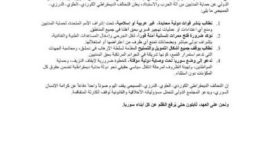 بيان «التحالف الديمقراطي الكردي–العلوي–الدرزي-المسيحي» يدعو لانتشار قوات دولية ووقف التهجير وحماية المدنيين في سوريا